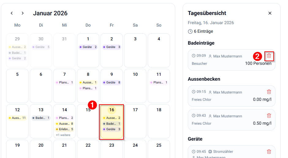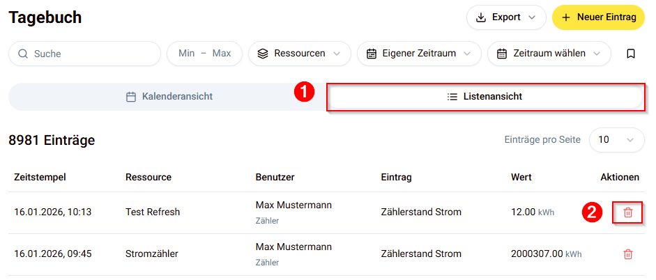 In der Listenansicht können Sie die Einträge ebenfalls löschen: