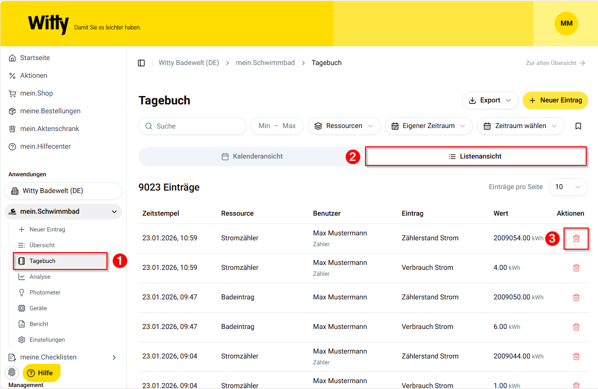 Sie können als Hauptnutzer (Status: "Admin") die vorgenommenen Einträge unter "Tagebuch" löschen.