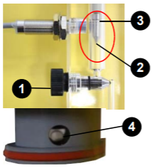 ![]() | Für eine ordnungsgemäße Funktion benötigen die Sensoren einen konstanten Messwasserdurchfluss zwischen 45 - 90 Liter/ Stunde. Hierfür muss der Schwimmer (2) gleichmäßig am Anschlag (3) anliegen und die Kugeln (4) innerhalb der Reinigungskappe der Chlormesszelle sichtbar an die Elektroden springen. Justieren Sie den Durchfluss bei Bedarf mittels der Stellschraube (1) bzw. bei größeren Änderungen an der Messwasserentnahme nach. |